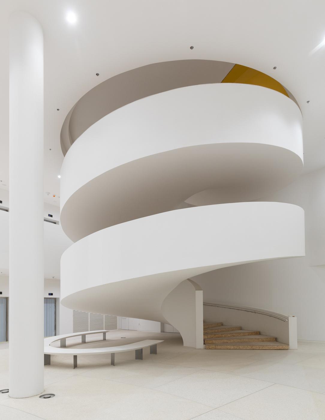 A három szintet egy 14 tonnás, függesztett, művészi csigalépcső köti össze az épület centrumában. A rugó formájú alsó csigalépcsőszakasz betonból készült, a zsaluszerkezetet a helyszínen, több hét alatt építették fel.