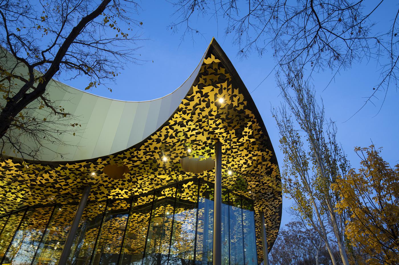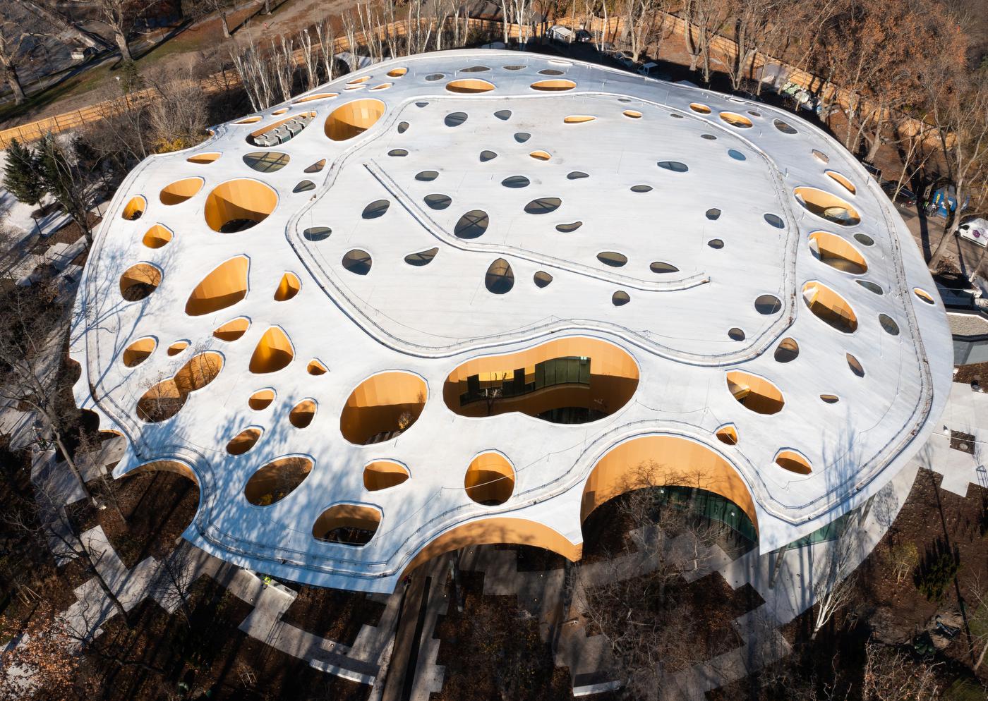 A hanghullámokat idéző tetőzet végig a lombkorona szintje alatt marad, így beleolvadva a természetbe. Rajta 100 egyedi tervezésű lyuk található, amelyeken fák bújnak át, vagy fénykútként szolgálnak, bevezetve a fényt az épületbe.