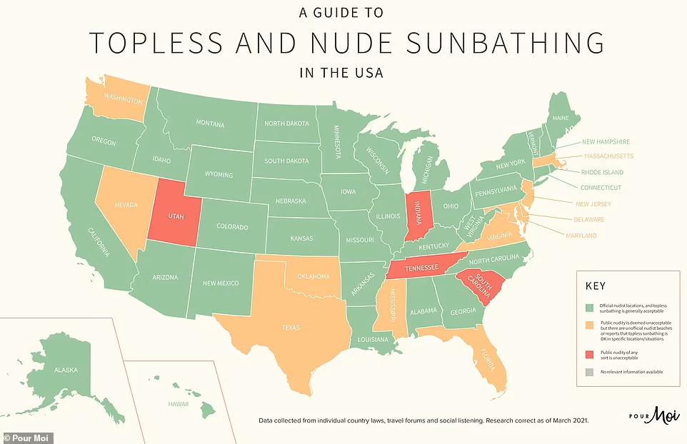 Annak ellenére, hogy 2020 nem a sok utazásról szólt, hanem inkább a karanténról, országlezárásokról, utazási tilalmakról, 10, 7 millió (!) alkalommal kerestek rá a Google-ban az emberek a „nude beach" (meztelenül strand), „nude resort" (meztelen üdülőhely) és a „sunbath nude" (napozás meztelenül) kulcsszavakra – számol be a Pour Moi a beszámolójában. A japánok, a brazilok, az új-zélandiak, az ausztrálok és az amerikaiak voltak a legkíváncsibbak a napozási szabályokra, szokásokra. Meglepő módon még az Egyesült Királyságban sem egységes, hogy mit lehet és mit nem, sőt az Egyesült Államokban is vannak olyan államok, ahol tilos topless napozni. Nagy-Britanniában (Anglia, Wales, Skócia) le lehet dobni a bikinifelsőt, ám Írországban nagyon nem örülnek neki. Amerikában – ahogy a lenti térképen is látszik majd – van 4 konzervatív állam, ahol tiltott a topless napozás.