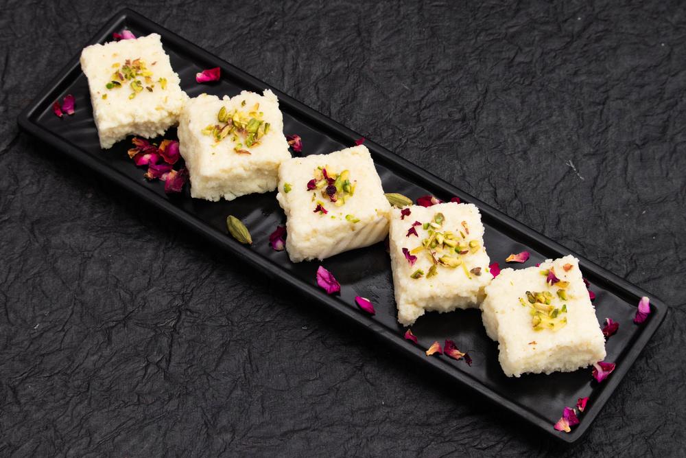 Nincs olyan indiai gyerek, aki ne rajongana ezért a desszertért. Sok fajta létezik belőle, de a legnépszerűbb a kókuszos, a mandulás és a pisztáciás változat. A barfi textúrája kimondottan puha, és nem túl édes. Eredetileg a tej a fő összetevője, de könnyen összedobható a vegán változata is. Annyi az egész, hogy fél csésze vizet és egy csésze cukrot egy tapadásmentes serpenyőbe közepes lángon felmelegítünk, majd hozzáadjuk a kardamomot, és hagyjuk felforrni. Ezután kerül bele mandula- és kesudió liszt, majd miután ezek szépen összeálltak, belerakjuk a kókuszolajat, és állandó kevergetés mellett 15-20 percig főzzük. Amikor már egyáltalán nem ragad a massza, tegyük egy téglalap alakú tálba, simítsuk el, majd vágjuk négyzet vagy rombusz alakúra.