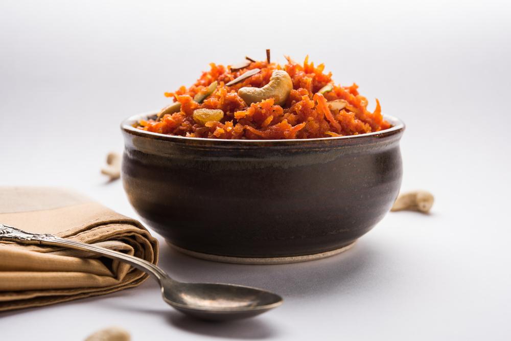 Ez megint csak egy klasszikus indiai desszert, reszelt sárgarépából, cukorból, tejből és khoyából (a tej szilárd részei, amit teljes zsírtartalmú tej párolásával és redukálásával nyernek ki) készül. Különleges alkalmakkor és fesztiválokon rendszeresen a terítéken van. A vegán változat itt is könnyen elérhető. Annyi csak a titok, hogy a tejet és a khoyát házi kesudiótejre (1 csésze nyers kesudió + 3 csésze víz) cseréljük. Hogy ne csak vegán, de extraegészséges is legyen, a cukor is kimaradhat belőle, és nem lesz hiányérzetünk a sárgarépa természetes édes ízének köszönhetően. Ha mégis kellene egy kis plusz édes íz, akár datolya is kerülhet bele.