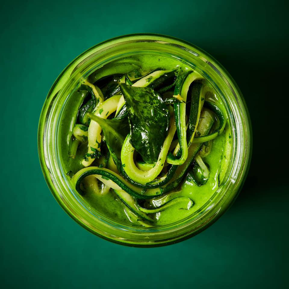 A budapesti Fruccola hálózat kávézó és salátabár, de leginkább attól népszerű, hogy összeválogatható, laktató salátáival és napi leveseivel az egészséges életmód kedvelői változatos és bőséges menüt kaphatnak. A képen egy spenótos petrezselyemkrém levest láthatunk cukkinispirállal, de már színes-illatos-finom gyerekleveseket is rendelhetünk Fruccola Sup Kids néven, amelyeket maci üvegekben szállítanak ki.