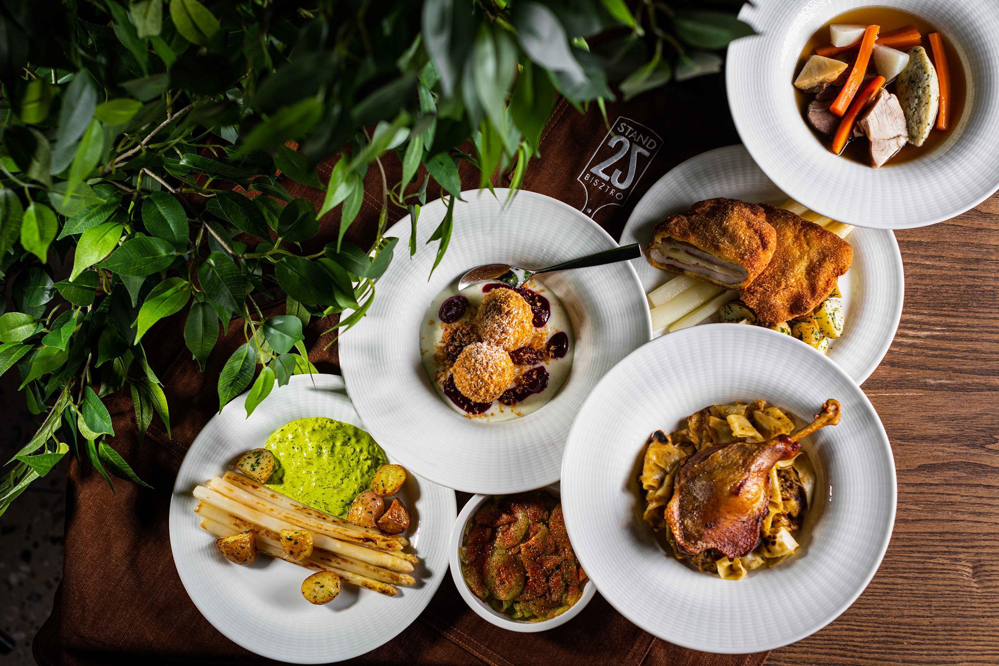 A Stand 25 bisztróból kétféle módon kérhetjük elvitelre a menünket 11 és 20 óra között. Vagy hidegen, ez esetben az ételek otthon néhány perces előkészületet igényelnek, vagy melegen, amikor is javasoljuk a fogásokat minél előbb elfogyasztani. Házhozszállításkor előre egyeztetett időpontban érkezik otthonunkba az étel, így biztosan nem kell újramelegíteni, amit készen kérünk. A menük fantáziadúsak és színesek: előételnek például képzeljünk el egy faszénen grillezett padlizsánsalátát vászolyi sajtkrémmel, sült paradicsommal; főételnek rakott burgonyát tormás céklasalátával; desszertnek pedig tejberizst sós karamellel.