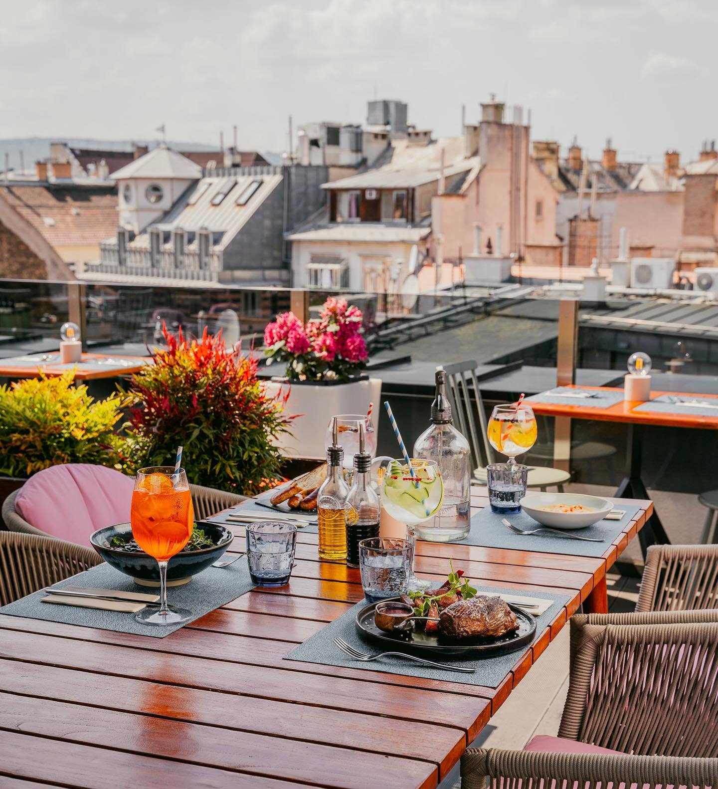 Szintén a pesti oldalon található ez a gyöngyszem, egészen pontosan a Bástya utca tetőteraszán hűsölhetsz egy finom ital mellett. A belváros szívében, ebben a sky barban nemcsak koktélozhatsz, hanem isteni meleg és hideg fogások közül is válogathatsz. Olyan finomságok sorakoznak az étlapon, mint a szarvasburger vagy a rozé kacsamell aszalt paradicsomos édesburgonya-krémmel, illetve vajhal narancsvirágos karalábéval. Ha pedig valami könnyűre vágynál egy hideg aperol spritz mellé, akkor kérhetsz például tapasokat is. Asztalt itt tudsz foglalni.