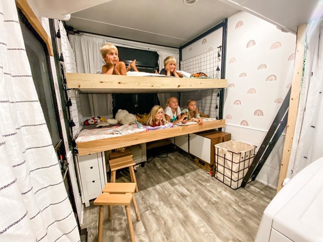 A „gyerekszobán" is látszik, hogy mennyire praktikusan tervezték meg: mindenkinek jut hely, nagy ágyakban lustálkodhatnak, amely alatt rengeteg tároló van. A gyerekrész az autó hátsó végében kapott helyet, a 13 éves lányuk pedig még egy privát kis kuckót is kapott a galérián.