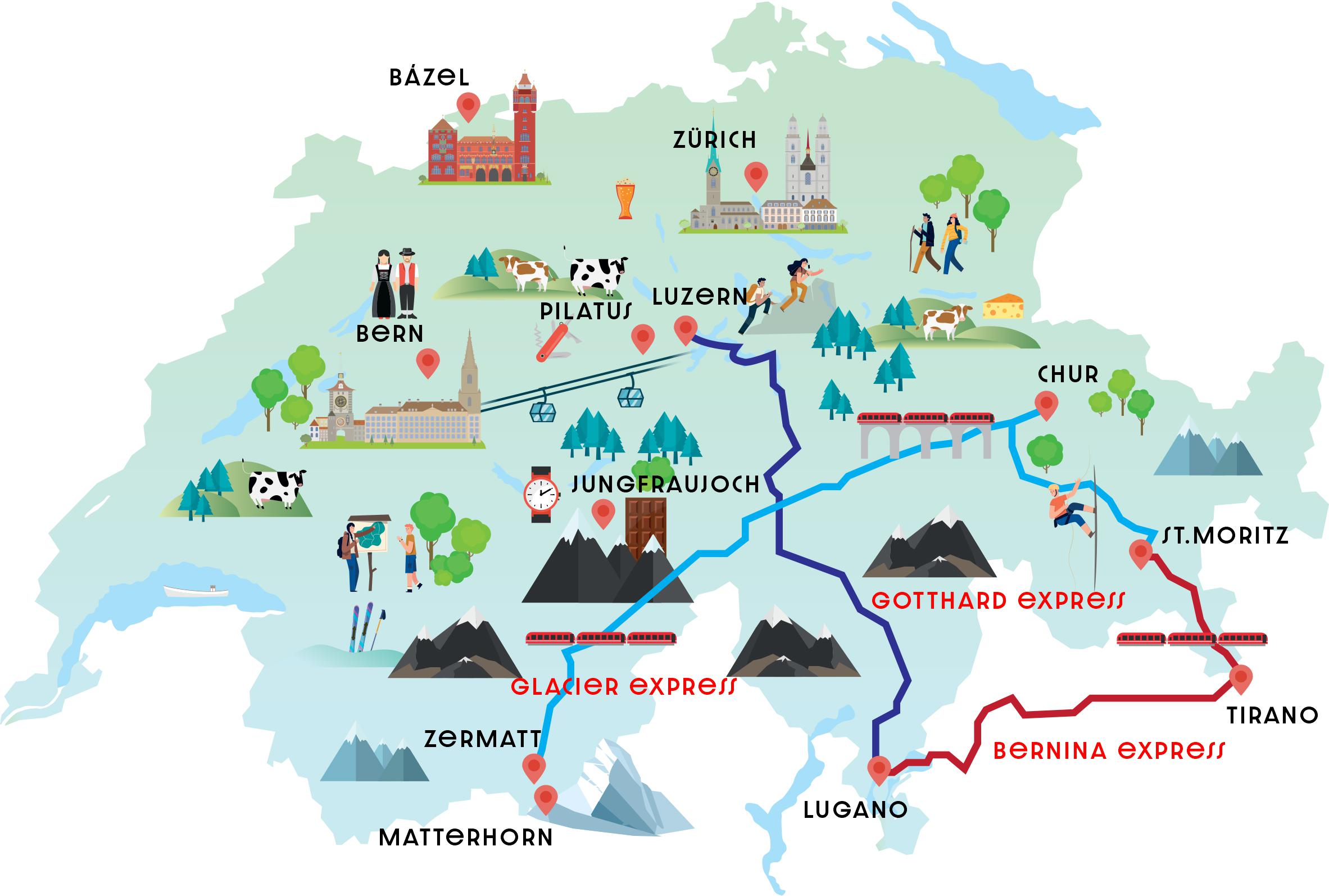 Mintha egy csodálatos mesekönyv lapjain utaznánk: hatalmas hegycsúcsok, csillogó tavak, elképesztően zöld mezők, cuki bocik váltakoznak az út során. Svájcban sokfelé fogad minket ez a látvány, de a három leghíresebb, leglátványosabb útvonal a Glacier Express, a Bernina Express, valamint a Gotthard Panorama Express, ezek mellett hatalmas panorámaablakokkal közlekedik még a Voralpen Express és a GoldenPass Panoramic Express is. Ezt az öt járatot három kiegészítő vonatúttal össze lehet kötni egy átfogó nyolcnapos körutazásban, ráadásul úgy, hogy még a legizgalmasabb, legnevezetesebb hegyi vasutakat is kipróbálhatjuk. Az ajánlott nyolcnapos, 1280 kilométeres kiruccanást ugyanis úgy állították össze, hogy két panorámavonat közt jusson idő egy-egy kirándulásra is. És amit talán mondani sem kell: a vonatok óraműpontossággal közlekednek, tiszták, és szinte mind kínál étkezési lehetőséget is.