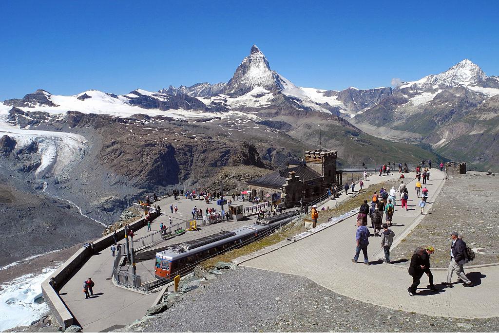 Egy szintén legendás hegyi vasút a Matterhorn közelébe visz fel, méghozzá a mesés Zermatt városkából. Zermatt egy elbűvölő hegyi település, amelynek még a nyár kellős közepén is síközpont jellege van. Innen a Matternhorn lábához a Gornergrat nevű kisvasút visz fel, olyan elképesztően szép tájakon, hogy ide-oda pattog az ember a kocsi két oldala közt, mert nem tudja, merre fotózzon. A Swiss Travel Pass erre is 50%-os kedvezményt jelent és mivel rendkívül népszerű, érdemes előre helyet foglalni. Sportosabb utazók visszafele akár végig lesétálhatnak Zermattba, de a kényelmesebbeknek is érdemes legalább egy megállót gyalogolni. A Rotenboden állomásnál célszerű leszállni (a csúcstól az első megálló lefelé), ahonnan pár perc séta az ikonikus Riffelsee. Ha ragyogó napos idő van, ebben csodálatosan tükröződik a 4478 méter magas Matterhorn, Európa egyik legmagasabb és legjellegzetesebb formájú csúcsa. A tótól egy könnyű 3 km-es séta vezet le a következő megállóig, a Riffelbergig.