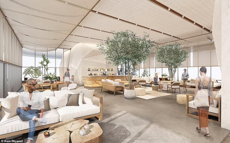Az Aura Skypool tér kialakításakor természetes anyagokat, követ és betont használtak, és mindenhol megtalálhatók a most nagyon menő modern geometriai formák is. Érdekes módon a világ egyik leggazdagabb nemzetének vállalkozói nem az „arany és ragyogás" tematikát vagy az orientális formavilágot választották, hanem inkább a modern, nyugati stílust. Egy mesterséges oázist álmodtak meg a felhőkarcoló 50. emeletére, ahol a növények és a természetes anyagok összhangban vannak, és ezzel energikus légkört teremtenek. A lounge-ban a nemzetközi ízek mellett természetesen közel-keleti fogásokat is rendelhetünk.