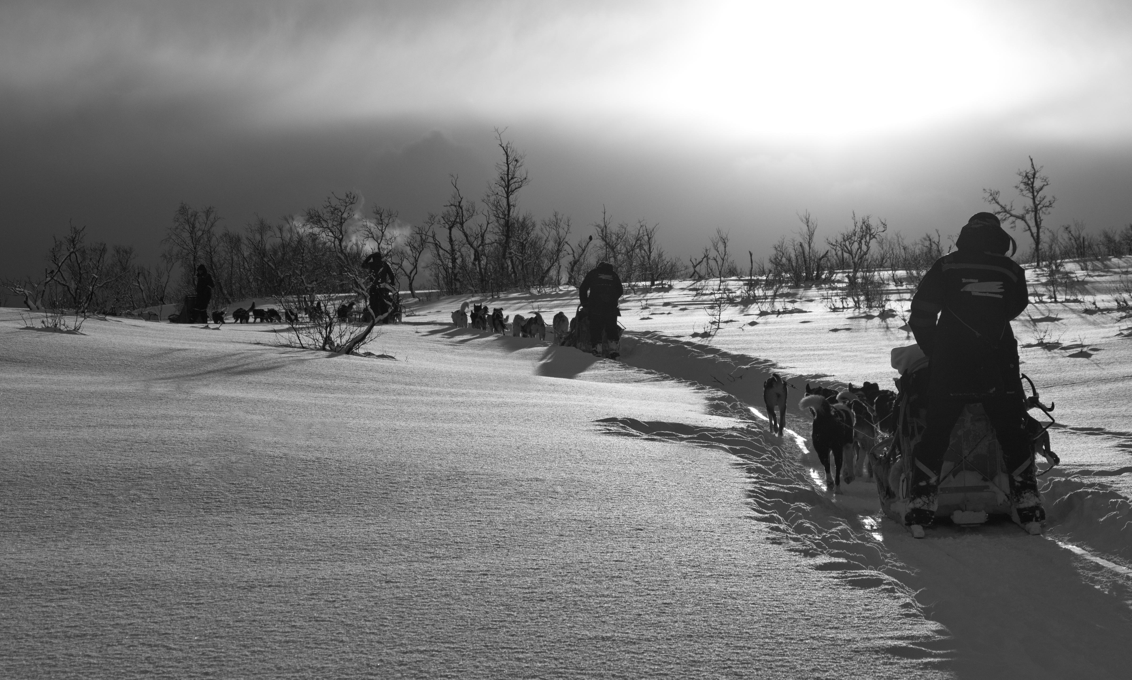 Hárman sátrazunk az észak-norvég télben, egynapnyi kutyaszános távolságra a célunktól, a norvég–svéd–finn hármas határtól. Reggel, miközben Tromsø-ben bepakoltunk túravezetőnk, István autójába, az Ázsiából terjedő járványról beszélgettünk – arról, hogy a vírus elérte Európát. Korlátozásokról, bezárkózásról szóltak a hírek. Inkább gyors számvetést végeztünk: kutyák, vagyis a szánjainkat húzó 16 alaszkai husky a furgonban, a három szán a tetőcsomagtartón, felszerelés, kutyakaja, extra hámok és extra felszerelés rendben, kutyakabátok (éjszakára, viharos idő esetére) bent, élelem nekünk, sátor, hálózsák, edények, fejlámpák, elsősegély felszerelés és túlélő cuccok szintén bent – mehetünk!