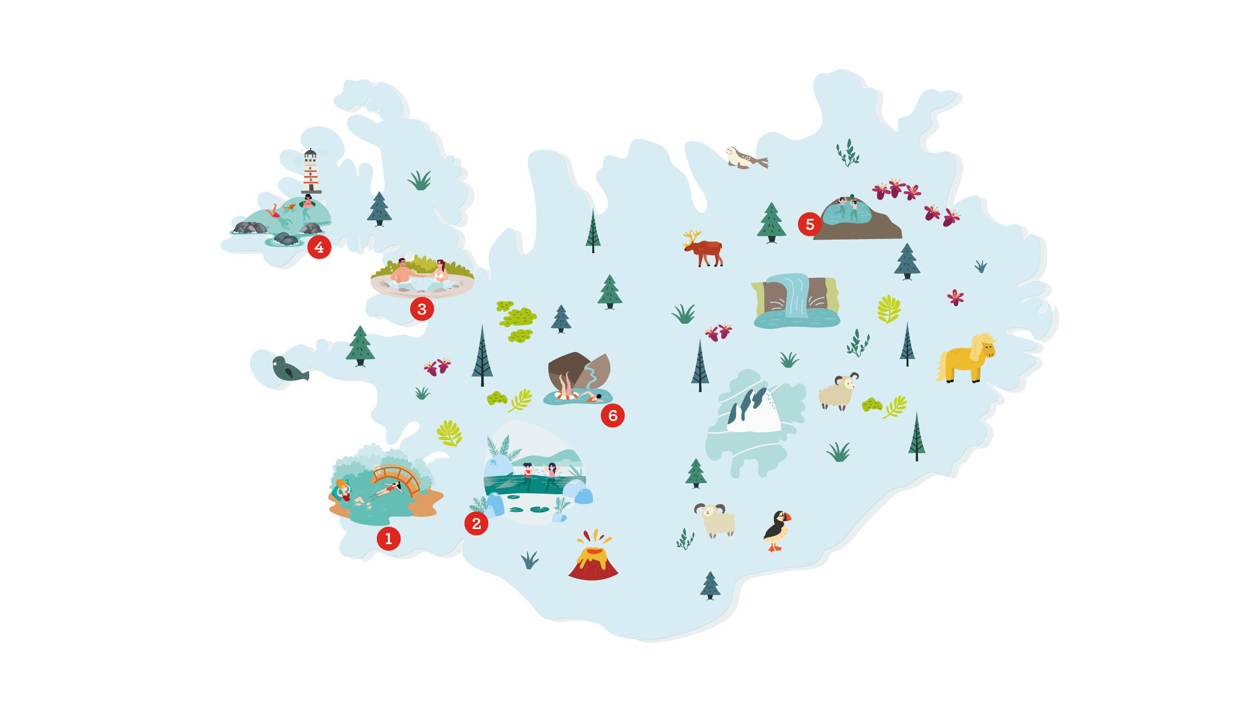 - Kiépített termálfürdők. Ide tartoznak a legismertebb és legnagyobb fürdőhelyek, mint a Blue Lagoon, a Secret Lagoon, a Mývatn, a Krauma vagy a GeoSea.