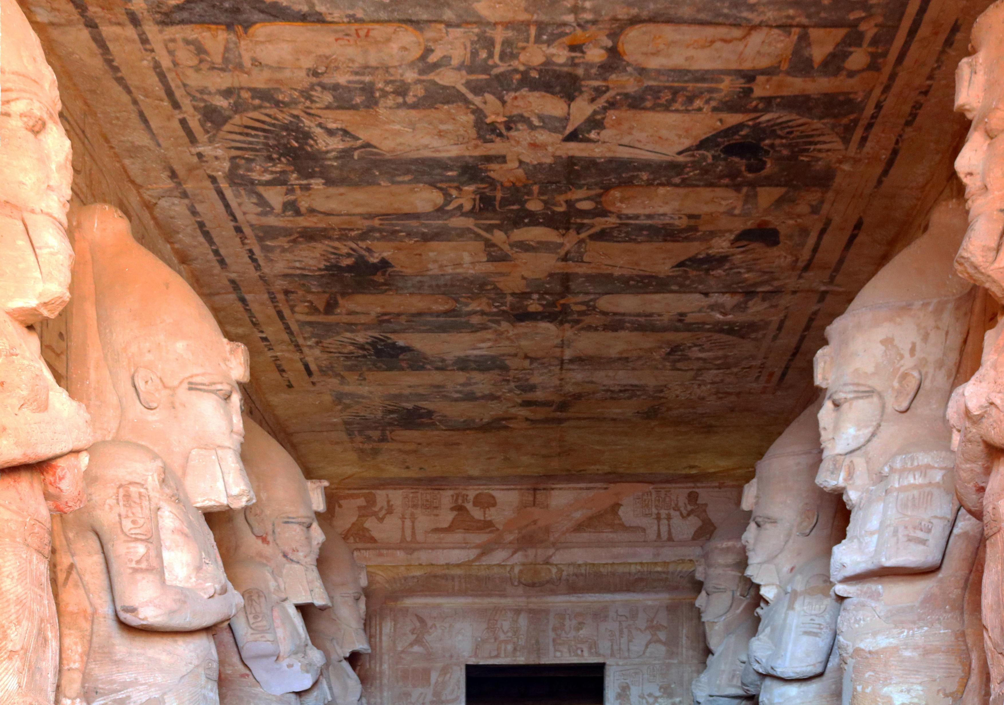 A főtemplom bejáratánál álló szobrok 30 méter magasak és együtt 35 méter szélesek. A nagytemplom több helyiségből, kamrából áll, a kistemplom 150 méterrel odébb található. Az elhelyezkedésüket illetően pedig megfigyelhető egy furcsaság: mielőtt a templomokat áthelyezték, évente kétszer a nagytemplom kapuján besütött a nap és megvilágított a szentélyben ülő négy istenszoborból hármat (a negyediket, Ptah-t összekapcsolták a halállal, tehát őt ezért nem éri nap), méghozzá a teremtőisteneket. Ez a két nap az évben február 21-e – a vetés, sarjadás ünnepe– , és október 21-e, az áradás napja. A két dátum tükrözi II. Ramszesz születésének és koronázásának dátumát is, persze a napév és a mi naptári évünk nem egyezik, így ezekben a dátumokban vannak csúszások. Az egész szentély felépítése, díszítése és a hireoglifák történetei mind az egyiptomi istenek életéről, tetteiről, méltatásáról és imádatáról szólnak, így a gízai piramisok után a második legfontosabb feltárt történelmi emléknek számítanak Egyiptomban.