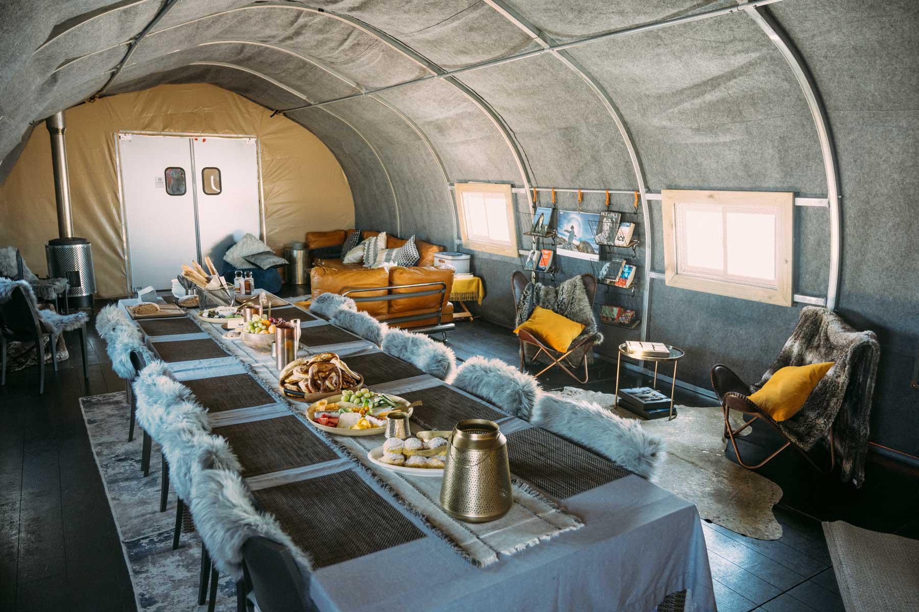 A napelemekkel fűtött hat sátor a 915 méter magas Wolf Fang’s oromra néz. A kényelmes lakóhelyeket saját fürdőszobákkal és műszőrme takarókkal tették otthonossá, az étkezések pedig minden vendég számára személyre szabottak.