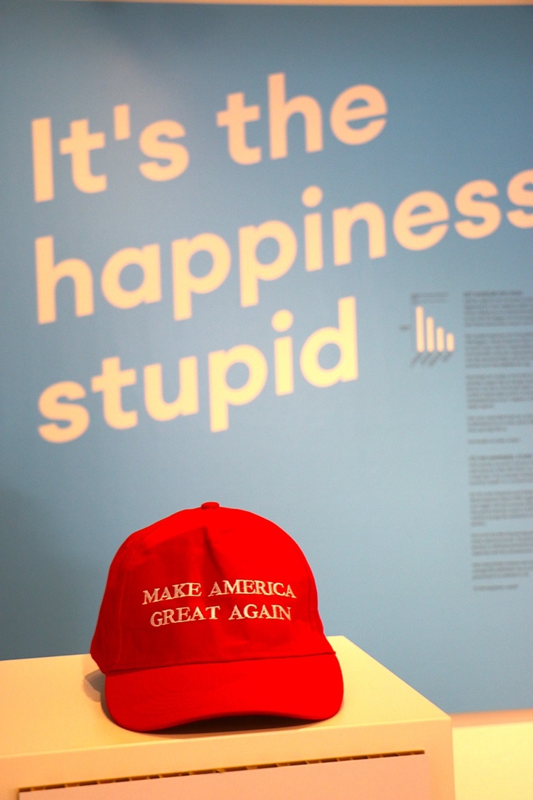 Az interaktív kiállítás 8 szobán át vezet rá bennünket a boldogság kulcsára: minden szoba más-más tematikát kínál, de nem csak a kutatási eredményeket osztják meg az érdeklődőkkel. „A boldogság politikája" a politikai manipulációt, a választások eszközeit, az elégedettség mérését mutatja be. „A boldogság története" szakasz elénk tárja, hogy az elméleti filozófiától hogyan jutottunk el addig a gyakorlatig, hogy a reklámokban boldogságot ígérnek a fogyasztóknak, és mi vevők sokszor el is hisszük ezt. A „Boldogság földrajza" részben megtudhatjuk, mely területeken vallják a kiegyensúlyozottabbnak magukat az emberek és hol él a legtöbb boldogtalan ember a világon.