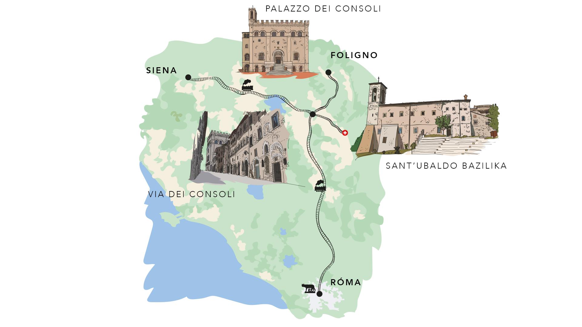 Közel fekszik Assisi Szent Ferenc szülővárosa. Itt is talált végső nyughelyre, a róla elnevezett, a város fölé magasodó, gótikus bazilika kriptájában. Végigjárhatjuk a szent életének legfontosabb állomásait, majd beülhetünk egy kávéházba a Minerva szoborral szemben, miként azt a regényben Mihály is tette.