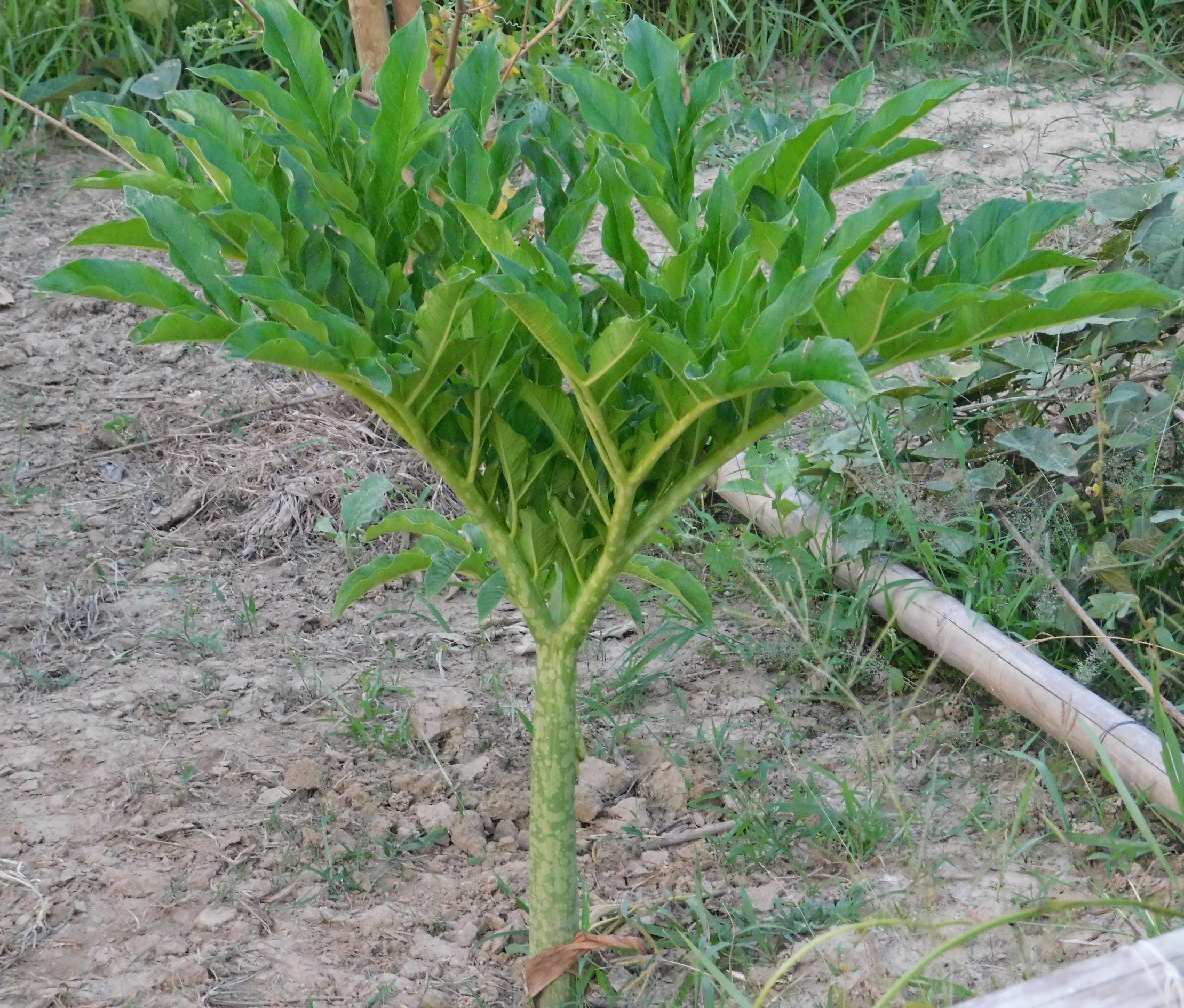Szumátrán a virág gumójából ételt főznek és sütnek, kb. úgy használják, mint a többi gumós vagy gyökérzöldséget, hiszen magas a keményítőtartalma. A dögszagú virágot a legyek porozzák be, hiszen vonzza őket a belőle áradó bűzös szag. A virágzás után egy kisebb fa marad a növényből és a gumója évekig pihen.