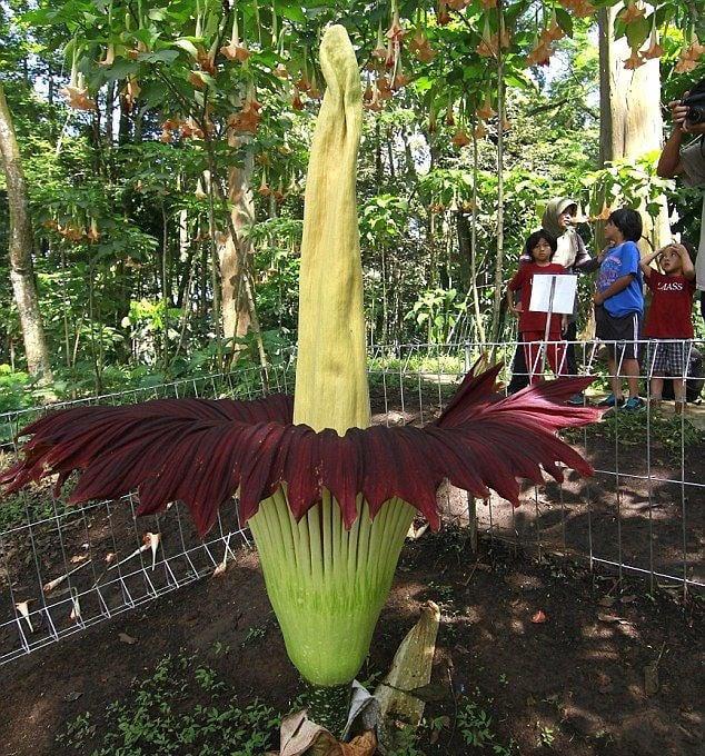 A buroklevéllel körülvett torzsavirágzat magassága több mint két méter, az eddigi rekorder egy 2,94 méter magas virág volt 2005-ben a stuttgarti Wilhelma botanikus kertben. A legnagyobb feljegyzett gumó a Királyi Botanikus Kertekhez tartozó Walesi hercegné-házban volt – ez a példány pihenő állapotban 91 kilogrammot nyomott, átlagosan egyébként 50-75 kilogram szokott lenni a gumó.